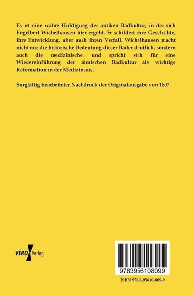 Es ist eine wahre Huldigung der antiken Badkultur, in der sich Engelbert Wichelhausen hier ergeht. Er schildert ihre Geschichte, ihre Entwicklung, aber auch ihren Verfall. Wichelhausen macht nicht nur die historische Bedeutung dieser Bäder deutlich, sondern auch die medizinische, und spricht sich für eine Wiedereinführung der römischen Badkultur als wichtige Reformation in der Medizin aus.