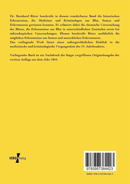 Dr. Bernhard Ritter beschreibt in diesem wunderbaren Band die historischen Erkenntnisse, die Mediziner und Kriminologen aus Blut, Samen und Exkrementen gewinnen konnten. Er erläutert dabei die chemische Untersuchung des Blutes, die Erkenntnisse aus Blut in unterschiedlichen Zuständen sowie bei mikroskopischen Untersuchungen. Ebenso beschreibt Ritter ausführlich die möglichen Erkenntnisse aus Samen und menschlichen Exkrementen.