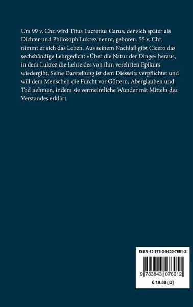 Lukrez: Über die Natur der Dinge Entstanden vor 55 v. Chr. Das wahrscheinlich unvollendet gebliebene Werk wurde als Handschrift von Cicero herausgegeben. Erstdruck: Brescia o. J. (ca. 1473). Erste deutsche Übersetzung durch Franz Xaver Mayr unter dem Titel »Von der Natur der Dinge«, Wien 1784/85. Der Text folgt der Übertragung durch Hermann Diels, die 1924 (postum) von Johannes Mewaldt herausgegeben wurde. Ergänzungen von Diels zur Ausfüllung von Lücken in den überlieferten Handschriften sind in [ ] gesetzt, nicht ergänzbare Stellen durch *** bezeichnet. Vollständige Neuausgabe mit einer Biographie des Autors. Herausgegeben von Karl-Maria Guth. Berlin 2015. Textgrundlage ist die Ausgabe: Lukrez: Über die Natur der Dinge. Aus dem Lateinischen übersetzt von Hermann Diels, Berlin: Aufbau, 1957 (Philosophische Bücherei, Bd. 12). Die Paginierung obiger Ausgabe wird in dieser Neuausgabe als Marginalie zeilengenau mitgeführt. Umschlaggestaltung von Thomas Schultz-Overhage unter Verwendung des Bildes: Ricci, Marco: Römische Ruinen. Gesetzt aus Minion Pro, 11 pt. Über den Autor: Um 99 v. Chr. wird Titus Lucretius Carus, der sich später als Dichter und Philosoph Lukrez nennt, geboren. 55 v. Chr. nimmt er sich das Leben. Aus seinem Nachlaß gibt Cicero das sechsbändige Lehrgedicht »Über die Natur der Dinge« heraus, in dem Lukrez die Lehre des von ihm verehrten Epikurs wiedergibt. Seine Darstellung ist dem Diesseits verpflichtet und will dem Menschen die Furcht vor Göttern, Aberglauben und Tod nehmen, indem sie vermeintliche Wunder mit Mitteln des Verstandes erklärt.