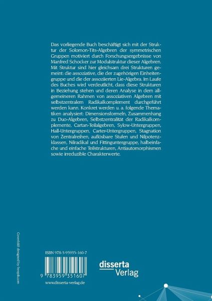 Das vorliegende Buch beschäftigt sich mit der Struktur der Solomon-Tits-Algebren der symmetrischen Gruppen motiviert durch Forschungsergebnisse von Manfred Schocker zur Modulstruktur dieser Algebren. Mit Struktur sind hier gleichsam drei Strukturen gemeint: die assoziative, die der zugehörigen Einheitengruppe und die der assoziierten Lie-Algebra. Im Laufe des Buches wird verdeutlicht, dass diese Strukturen in Beziehung stehen und deren Analyse in dem allgemeineren Rahmen von assoziativen Algebren mit selbstzentralem Radikalkomplement durchgeführt werden kann. Konkret werden u. a. folgende Thematiken analysiert: Dimensionsformeln, Zusammenhang zu Duo-Algebren, Selbstzentralität der Radikalkomplemente, Cartan-Teilalgebren, Sylow-Untergruppen, Hall-Untergruppen, Carter-Untergruppen, Stagnation von Zentralreihen, auflösbare Stufen und Nilpotenzklassen, Nilradikal und Fittinguntergruppe, halbeinfache und einfache Teilstrukturen, Antiautomorphismen sowie irreduzible Charakterwerte.