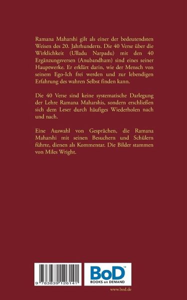 Ramana Maharshi gilt als einer der bedeutendsten Weisen des 20. Jahrhunderts. Die 40 Verse über die Wirklichkeit (Ulladu Narpadu) mit den 40 Ergänzungsversen (Anubandham) sind eines seiner Hauptwerke. Er erklärt darin, wie der Mensch von seinem Ego-Ich frei werden und zur lebendigen Erfahrung des wahren Selbst finden kann. Die 40 Verse sind keine systematische Darlegung der Lehre Ramana Maharshis, sondern erschließen sich dem Leser durch häufiges Wiederholen nach und nach. Eine Auswahl von Gesprächen, die Ramana Maharshi mit seinen Besuchern und Schülern führte, dienen als Kommentar. Die Bilder stammen von Miles Wright.