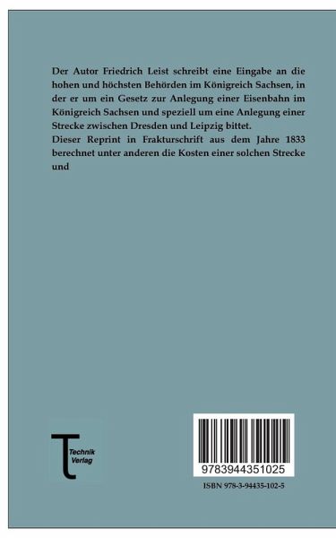 Der Autor Friedrich Leist schreibt eine Eingabe an die hohen und höchsten Behörden im Königreich Sachsen, in der er um ein Gesetz zur Anlegung einer Eisenbahn im Königreich Sachsen und speziell um eine Anlegung einer Strecke zwischen Dresden und Leipzig bittet.