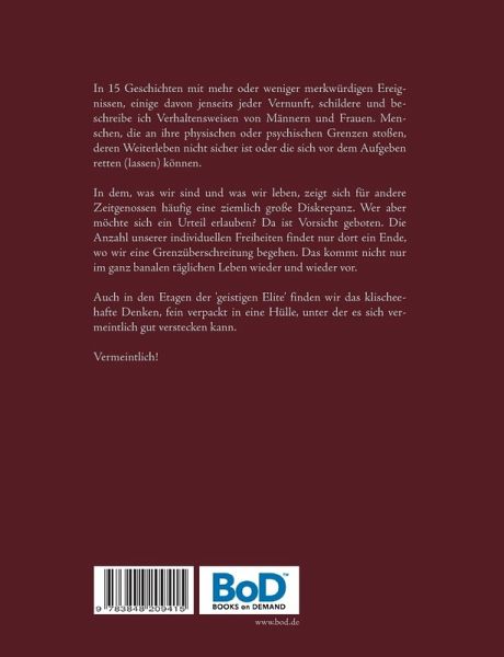 In 15 Geschichten mit mehr oder weniger merkwürdigen Ereignissen, einige davon jenseits jeder Vernunft, schildere und beschreibe ich Verhaltensweisen von Männern und Frauen, Menschen, die an ihre physischen oder psychischen Grenzen stoßen, deren Weiterleben nicht sicher ist oder die sich vor dem Aufgeben retten (lassen) können.