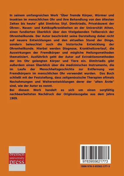 In seinem umfangreichen Werk \"Über fremde Körper, Würmer und Insekten im menschlichen Ohr und ihre Behandlung von den ältesten Zeiten bis heute\" gibt Dimitrios Styl. Dimitriadis, Privatdozent der Ohren-, Nasen- und Kehlkopfkrankheiten an der Universität Athen, einen fundierten Überblick über den titelgebenden Teilbereich der Ohrenheilkunde. Der Autor beschränkt seine Darstellung dabei nicht auf neuere Entwicklungen und den aktuellen Stand der Dinge, sondern beleuchtet auch die historische Entwicklung der Ohrenheilkunde. Hierbei werden Diagnose, Krankheitsverlauf, die Auswirkungen der Fremdkörper und mögliche Heilungsmethoden thematisiert. Ausführlich geht der Autor auf Extraktionsmethoden der ins Ohr gelangten Körper und Tiere ein. Dimitriadis gibt außerdem einen Überblick über die medizinischen Instrumente, die im Laufe der Menschheitsgeschichte zur Entfernung von Fremdkörpern im menschlichen Ohr verwendet wurden. Das Buch schließt mit der Feststellung, dass zeitgenössische Therapien oftmals Nachahmungen und Weiterentwicklungen derer der \"alten Ärzte\" sind, wie der Autor es nennt.