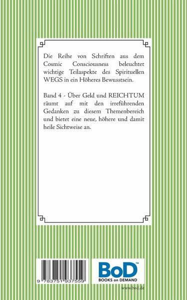 Die Reihe von Schriften aus dem Cosmic Consciousness beleuchtet wichtige Teilaspekte des Spirituellen WEGS in ein Höheres Bewusstsein. Band 4 - Über Geld und REICHTUM räumt auf mit den irreführenden Gedanken zu diesem Themenbereich und bietet eine neue, höhere und damit heile Sichtweise an.