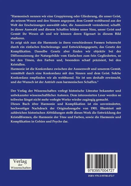 Dieses Buch über Harmonie und Komplikation ist ein unveränderter, hochwertiger Nachdruck der Originalausgabe von 1901. Illustriert mit zahlreichen historischen Abbildungen stellt dieses Werk die Entwicklung der Kristallformen, die Harmonie der Töne und Farben, sowie die Harmonie und Komplikation in Gehirn und Psyche dar.