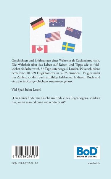 Geschichten und Erfahrungen einer Weltreise als Rucksacktouristin. Die Wahrheit über das Leben auf Reisen und Tipps wie es (vielleicht) einfacher wird. 87 Tage unterwegs, 6 Länder, 45 verschiedene Schlaforte, 40.389 Flugkilometer in 39:75 Stunden... Es gibt nicht nur Zahlen, sondern auch unzählige Erlebnisse. In diesem Buch sind ein paar in Kurzgeschichten zusammen gefasst.Viel Spaß beim Lesen!"Das Glück findet man nicht am Ende eines Regenbogens, sondern nur, wenn man erkennt wie schön er ist!"