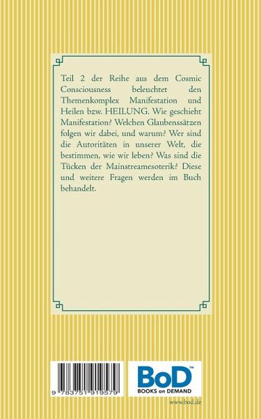 Teil 2 der Reihe aus dem Cosmic Consciousness beleuchtet den Themenkomplex Manifestation und Heilen bzw. HEILUNG. Wie geschieht Manifestation? Welchen Glaubenssätzen folgen wir dabei, und warum? Wer sind die Autoritäten in unserer Welt, die bestimmen, wie wir leben? Was sind die Tücken der Mainstreamesoterik? Diese und weitere Fragen werden im Buch behandelt.
