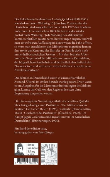 Der linksliberale Erzdemokrat Ludwig Quidde (1858-1941) war ab dem Ersten Weltkrieg 15 Jahre lang Vorsitzender der Deutschen Friedensgesellschaft und erhielt 1927 den Friedensnobelpreis. Er schrieb schon 1893 die heute leider wieder hochaktuelle Warnung: "Jede Stärkung des Militarismus kommt schließlich reaktionären Bestrebungen zugute, und will man einer freieren Auffassung im Staatswesen die Bahn öffnen, so muss man entschlossen den Militarismus angreifen; denn in ihm steckt der Kern und der Halt des im Grunde doch noch immer halbdespotischen Systems. ... Mit dem brutalen Übermute des Siegers wird der Militarismus unserem Kulturleben, der bürgerlichen Gesellschaft und der Freiheit den Fuß auf den Nacken setzen und wird unser wirtschaftliches Leben für seine Zwecke ausnützen." Die Schulen in Deutschland waren in einem erbärmlichen Zustand. Überall im zivilen Bereich wurde gespart. Doch wenn es um Ausgaben für die Massenmordtechnologien des Militärs ging, konnte das Geld von den Regierenden stets ohne Begrenzung umgeleitet werden.Die hier vorgelegte Sammlung enthält vier Schriften Quiddes über Kriegsideologie und Pazifismus: "Der Militarismus im heutigen Deutschen Reich" (1893); "Caligula" (Skandal-Satire, 1894); "Geschichte des Pazifismus" (Überblick, 1922); "Im Kampf gegen Cäsarismus und Byzantinismus im Kaiserlichen Deutschland" (Erinnerungen, 1926).Ein Band der edition pace,herausgegeben von Peter Bürger