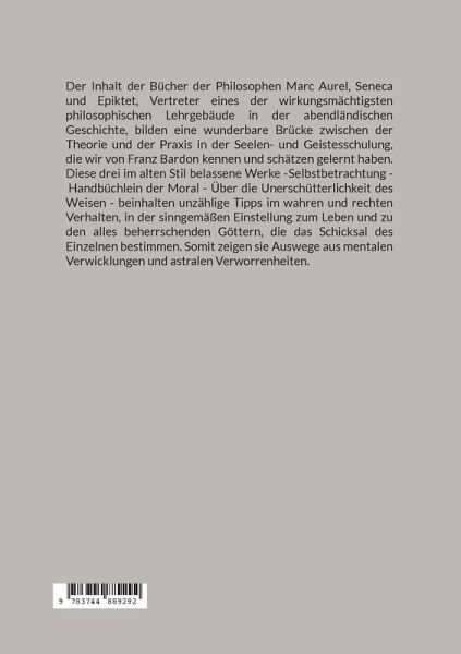 Der Inhalt der Bücher der Philosophen Marc Aurel, Seneca und Epiktet, Vertreter eines der wirkungsmächtigsten philosophischen Lehrgebäude in der abendländischen Geschichte, bilden eine wunderbare Brücke zwischen der Theorie und der Praxis in der Seelen- und Geistesschulung, die wir von Franz Bardon kennen und schätzen gelernt haben. Diese drei im alten Stil belassene Werke -Selbstbetrachtung - Handbüchlein der Moral - Über die Unerschütterlichkeit des Weisen - beinhalten unzählige Tipps im wahren und rechten Verhalten, in der sinngemäßen Einstellung zum Leben und zu den alles beherrschenden Göttern, die das Schicksal des Einzelnen bestimmen. Somit zeigen sie Auswege aus mentalen Verwicklungen und astralen Verworrenheiten.
