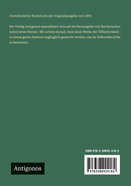 Unveränderter Nachdruck der Originalausgabe von 1870. Der Verlag Antigonos spezialisiert sich auf die Herausgabe von Nachdrucken historischer Bücher. Wir achten darauf, dass diese Werke der Öffentlichkeit in einem guten Zustand zugänglich gemacht werden, um ihr kulturelles Erbe zu bewahren.