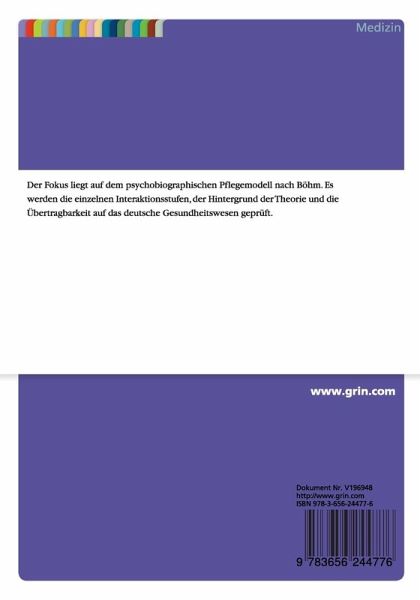 Studienarbeit aus dem Jahr 2012 im Fachbereich Pflegewissenschaften, einseitig bedruckt, Note: 1,7, Hochschule für Technik und Wirtschaft des Saarlandes (SoWi), Sprache: Deutsch, Abstract: Der Fokus liegt auf dem psychobiographischen Pflegemodell nach Böhm. Es werden die einzelnen Interaktionsstufen, der Hintergrund der Theorie und die Übertragbarkeit auf das deutsche Gesundheitswesen geprüft.