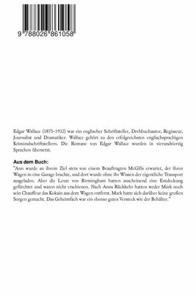 Edgar Wallace (1875-1932) war ein englischer Schriftsteller, Drehbuchautor, Regisseur, Journalist und Dramatiker. Wallace gehört zu den erfolgreichsten englischsprachigen Kriminalschriftstellern. Die Romane von Edgar Wallace wurden in vierundvierzig Sprachen übersetzt. Aus dem Buch: "Ann wurde an ihrem Ziel stets von einem Beauftragten McGills erwartet, der ihren Wagen in eine Garage brachte, und dort wurde ohne ihr Wissen der eigentliche Transport ausgeladen. Aber die Leute von Birmingham hatten anscheinend eine Entdeckung gefürchtet und waren nicht erschienen. Nach Anns Rückkehr hatten weder Mark noch sein Chauffeur das Kokain aus dem Wagen entfernt. Mark hatte sich darüber keine großen Sorgen gemacht. Das Geheimfach war ein ebenso gutes Versteck wie der Behälter."