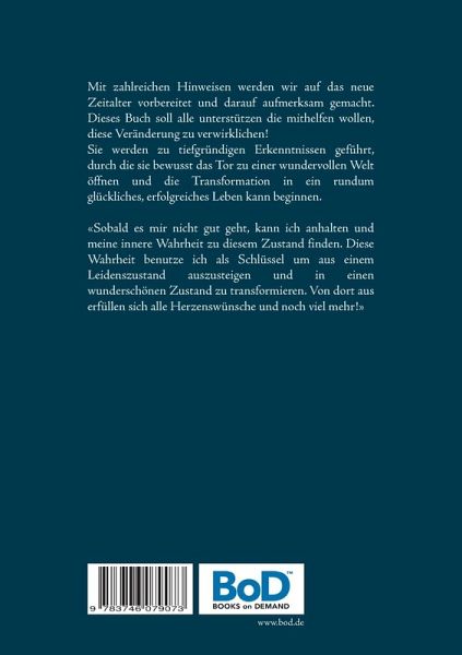 Mit zahlreichen Hinweisen werden wir auf das neue Zeitalter vorbereitet und darauf aufmerksam gemacht. Dieses Buch soll alle unterstützen, die mithelfen wollen, diese Veränderung zu verwirklichen! Sie werden zu tiefgründigen Erkenntnissen geführt, durch die sie bewusst das Tor zu einer wundervollen Welt öffnen, und die Transformation in ein rundum glückliches, erfolgreiches Leben kann beginnen.«Sobald es mir nicht gut geht, kann ich anhalten und meine innere Wahrheit zu diesem Zustand finden. Diese Wahrheit benutze ich als Schlüssel, um aus einem Leidenszustand auszusteigen und in einen wunderschönen Zustand zu transformieren. Von dort aus erfüllen sich alle Herzenswünsche und noch viel mehr!»