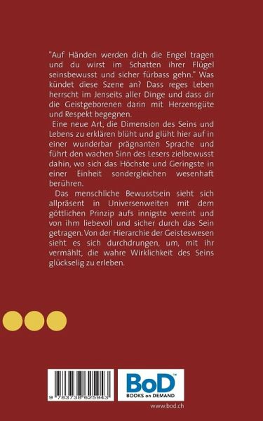"Auf Händen werden dich die Engel tragen und du wirst im Schatten ihrer Flügel seinsbewusst und sicher fürbass gehn." Was kündet diese Szene an? Dass reges Leben herrscht im Jenseits aller Dinge und dass dir die Geistgeborenen darin mit Herzensgüte und Respekt begegnen.Eine neue Art, die Dimension des Seins und Lebens zu erklären blüht und glüht hier auf in einer wunderbar prägnanten Sprache und führt den wachen Sinn des Lesers zielbewusst dahin, wo sich das Höchste und Geringste in einer Einheit sondergleichen wesenhaft berühren.Das menschliche Bewusstsein sieht sich allpräsent in Universenweiten mit dem göttlichen Prinzip aufs innigste vereint und von ihm liebevoll und sicher durch das Sein getragen. Von der Hierarchie der Geisteswesen sieht es sich durchdrungen, um, mit ihr vermählt, die wahre Wirklichkeit des Seins glückselig zu erleben.