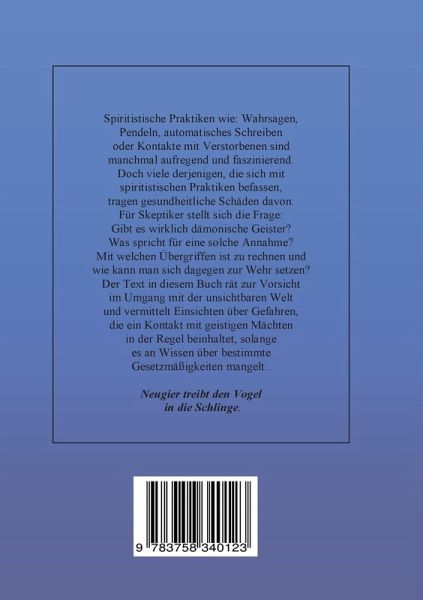 Spiritistische Praktiken wie: Wahrsagen, Pendeln, automatisches Schreiben oder Kontakte mit Verstorbenen sind manchmal aufregend und faszinierend. Doch viele, die sich mit spiritistischen Praktiken befassen, tragen gesundheitliche Schäden davon. Für Skeptiker stellt sich die Frage: Gibt es wirklich dämonische Geister? Was spricht für eine solche Annahme? Mit welchen Übergriffen ist zu rechnen und wie kann man sich dagegen zur Wehr setzen? Der Text in diesem Buch rät zur Vorsicht im Umgang mit der unsichtbaren Welt und vermittelt Einsichten über Gefahren, die ein Kontakt mit geistigen Mächten in der Regel beinhaltet, solange es an Wissen über bestimmte Gesetzmäßigkeiten mangelt.