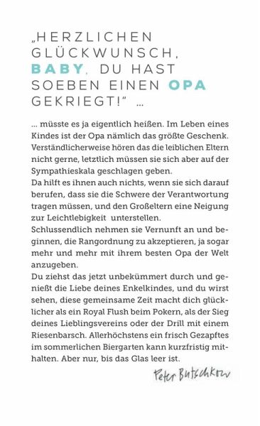 Opa ist der Beste! Jedes (Enkel)Kind weiß das. Doch bei aller Freude, die die Großelternschaft so mit sich bringt - von Zeit zu Zeit brauchen auch Opas mal eine Auszeit und vor allem eine ordentliche Dosis Humor. Dieses Überlebenstraining von Peter Butschkow eignet sich sowohl für den frisch gebackenen Neu-Opa wie auch für sturmerprobte Großväter.