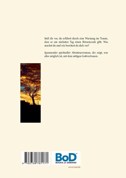 Stell dir vor, du erfährst durch eine Warnung im Traum, dass es am nächsten Tag einen Börsencrash gibt. Was machst du und wie bereitest du dich vor?Spannender spiritueller Abenteuerroman, der zeigt, was alles möglich ist, mit dem nötigen Gottvertrauen.