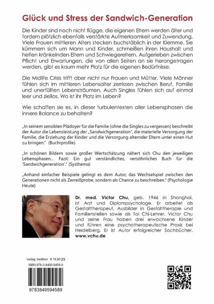 innere Balance zu behalten? In seinem sensiblen Plädoyer für die Familie (ohne die Singles zu vergessen) beschreibt der Autor die Lebensleistung der Sandwichgeneration , die materielle Versorgung der Familie, die Erziehung der Kinder und die Versorgung alternder Eltern unter einen Hut zu bringen. (Buchrprofile) In schönen Bildern sowie großer Wertschätzung nähert sich Chu den jeweiligen Lebensphase. Fazit: Ein gut verständliches, versöhnliches Buch für die Sandwichgeneration . (Systhema) Anhand einfacher Beispiele gelingt es dem Autor, das Wechselspiel zwischen den Generationen nicht als Zerreißprobe, sondern als Chance zu beschreiben. (Psychologie Heute)