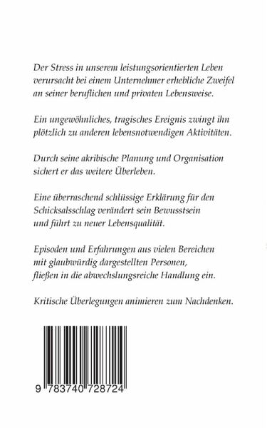 Der Stress in unserem leistungsorientierten Leben verursacht bei einem Unternehmer erhebliche Zweifel an seiner privaten und beruflichen Lebensweise.Ein ungewöhnliches, tragisches Ereignis zwingt ihn plötzlich zu anderen lebensnotwendigen Aktivitäten.Durch akribische Planung und Organisation sichert er das Überleben in einem zerstörten Umfeld.Eine überraschend schlüssige Erklärung für den Schicksalsschlag verändert sein Bewusstsein und führt zu einer neuen Lebensqualität.Zahlreiche Episoden und Erfahrungen aus vielen Bereichen, mit glaubwürdig dargestellten Personen, fließen in die abwechslungsreiche Handlung ein.Kritische Überlegungen animieren zum Nachdenken.