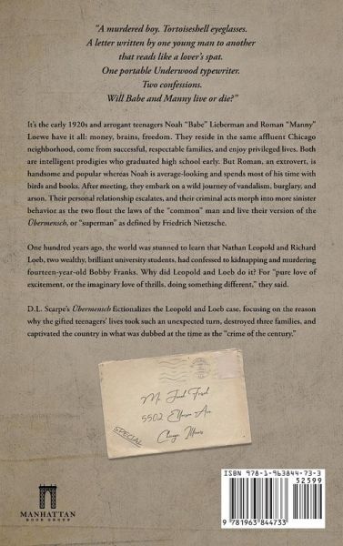 A murdered boy. Tortoiseshell eyeglasses. A letter written by a young man to another that reads like a lover's spat. One portable Underwood typewriter. Two confessions. Will Babe and Manny live or die? It's the early 1920s and arrogant teenagers Noah "Babe" Lieberman and Roman "Manny" Loewe have it all: money, brains, freedom. They reside in the same affluent Chicago neighborhood, come from successful, respectable families, and enjoy privileged lives. Both are intelligent prodigies who graduated high school early. But Roman, an extrovert, is handsome and popular whereas Noah is average-looking and spends most of his time with birds and books. After meeting, they embark on a wild journey of vandalism, burglary, and arson. Their personal relationship escalates, and their criminal acts morph into more sinister behavior as the two flout the laws of the "common" man and live their version of the Übermensch, or "superman" as defined by Friedrich Nietzsche. One hundred years ago, the world was stunned to learn that Nathan Leopold and Richard Loeb, two wealthy, brilliant university students, had confessed to kidnapping and murdering fourteen-year-old Bobby Franks. Why did Leopold and Loeb do it? For "pure love of excitement, or the imaginary love of thrills, doing something different," they said. D.L. Scarpe's Übermensch fictionalizes the Leopold and Loeb case, focusing on the reason why the gifted teenagers' lives took such an unexpected turn, destroyed three families, and captivated the country in what was dubbed at the time as the "crime of the century."