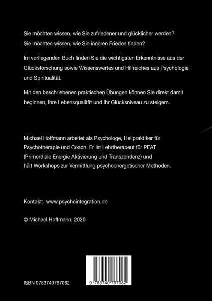 Sie möchten wissen, wie Sie zufriedener und glücklicher werden?Sie möchten wissen, wie Sie inneren Frieden finden?Im vorliegenden Buch finden Sie die wichtigsten Erkenntnisse aus der Glücksforschung zusammen mit Wissenswertem und Hilfreichem aus Psychologie und Spiritualität.Mit den beschriebenen praktischen Übungen können Sie direkt damit beginnen, Ihre Lebensqualität und Ihr Glücksniveau zu steigern.