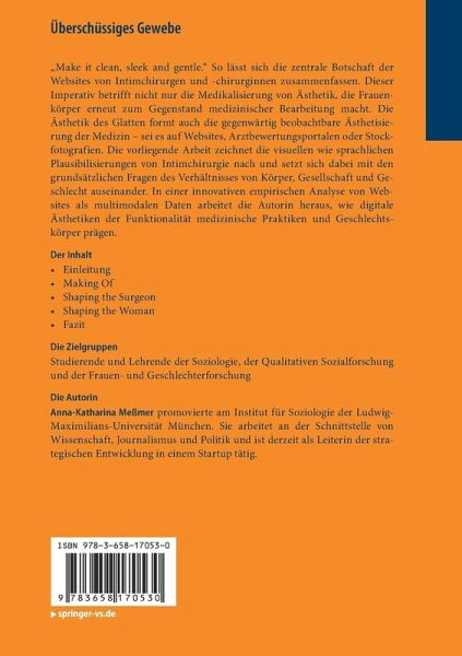 "... Eine der Stärken des Buchs liegt in Meßmers Aufmerksamkeit für jeden der drei grundlegenden Aspekte ihres Gegenstands - Internet, Medizin und Geschlecht - deren Zusammenwirken sie geschickt einfängt und beschreibt. Ihre multimodale Analyse ist ein überaus gelungenes Beispiel für die Anwendung und innovative Weiterentwicklung qualitativer Sozialforschung im digitalisierten Zeitalter. Die Autorin arbeitet nachvollziehbar heraus, wie Visualität und Semantik der Webseitentexte zusammenspielen, die Subjektpositionen von Ärzt_innen und Patientinnen mitkonstituieren und sich somit auf die einschneidenden Praktiken auswirken ..." (Susanne Richter, in: Gender, Jg. 10, Heft 3, 2018)