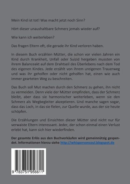 Mein Kind ist tot! Was macht jetzt noch Sinn? Hört dieser unaushaltbare Schmerz jemals wieder auf? Wie kann ich weiterleben? Das fragen Eltern oft, die gerade ihr Kind verloren haben.In diesem Buch erzählen Mütter, die schon vor vielen Jahren ein Kind durch Krankheit, Unfall oder Suizid hergeben mussten von ihrem Balanceakt auf dem Drahtseil des Überlebens nach dem Tod des eigenen Kindes. Jede erzählt von ihrem ureigenen Trauerweg und was ihr geholfen oder nicht geholfen hat, einen wie auch immer gearteten Weg zu beschreiten.Das Buch soll Mut machen durch den Schmerz zu gehen, ihn nicht zu vermeiden. Denn viele der Mütter empfinden, dass der Schmerz bleibt, aber dass sie harmonischer weiterleben, wenn sie den Schmerz als Wegbegleiter akzeptieren. Und manche sagen sogar, dass das Loch, in das sie fielen, zur Quelle wurde, aus der sie heute schöpfen.Die Erzählungen und Einsichten dieser Mütter sind nicht nur für verwaiste Eltern interessant. Jeder, der schon einmal einen Verlust erlebt hat, kann sich hier wiederfinden.