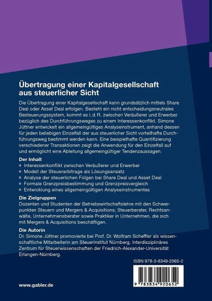 Einführung.- Methodische Grundlagen zur Ermittlung des steuerlich vorteilhaften Durchführungsweges.- Abstrakte Ermittlung des steuerlich vorteilhaften Durchführungsweges unter Berücksichtigung der bestehenden ertragsteuerlichen Einflussfaktoren.- Ableitung der steuerlichen Vorteilhaftigkeit von Share Deal oder Asset Deal mittels beispielhafter Quantifizierung.- Abschließende Zusammenfassung.