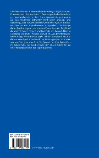 Mittelalterliche und frühneuzeitliche Schreiber, Maler, Illustratoren, Übersetzer und Autoren hatten offenbar spezifische Vorstellungen von Vorlagentreue; ihre Übertragungsleistungen wirken auf den modernen Betrachter nicht selten ungenau und eigenwillig. Aber es wäre zu einfach, von einer 'typisch mittelalterlichen' Art des Reproduzierens zu sprechen: Die Beiträge dieses Bandes zeigen, dass nur ein differenzierender Zugriff auf die verschiedenen Formen und Konzepte von Reproduktion in Mittelalter und Früher Neuzeit sinnvoll ist.