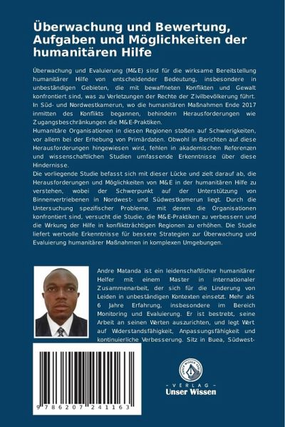 Überwachung und Evaluierung (M&E) sind für die wirksame Bereitstellung humanitärer Hilfe von entscheidender Bedeutung, insbesondere in unbeständigen Gebieten, die mit bewaffneten Konflikten und Gewalt konfrontiert sind, was zu Verletzungen der Rechte der Zivilbevölkerung führt. In Süd- und Nordwestkamerun, wo die humanitären Maßnahmen Ende 2017 inmitten des Konflikts begannen, behindern Herausforderungen wie Zugangsbeschränkungen die M&E-Praktiken.Humanitäre Organisationen in diesen Regionen stoßen auf Schwierigkeiten, vor allem bei der Erhebung von Primärdaten. Obwohl in Berichten auf diese Herausforderungen hingewiesen wird, fehlen in akademischen Referenzen und wissenschaftlichen Studien umfassende Erkenntnisse über diese Hindernisse.Die vorliegende Studie befasst sich mit dieser Lücke und zielt darauf ab, die Herausforderungen und Möglichkeiten von M&E in der humanitären Hilfe zu verstehen, wobei der Schwerpunkt auf der Unterstützung von Binnenvertriebenen in Nordwest- und Südwestkamerun liegt. Durch die Untersuchung spezifischer Probleme, mit denen die Organisationen konfrontiert sind, versucht die Studie, die M&E-Praktiken zu verbessern und die Wirkung der Hilfe in konfliktträchtigen Regionen zu erhöhen. Die Studie liefert wertvolle Erkenntnisse für bessere Strategien zur Überwachung und Evaluierung humanitärer Maßnahmen in komplexen Umgebungen.