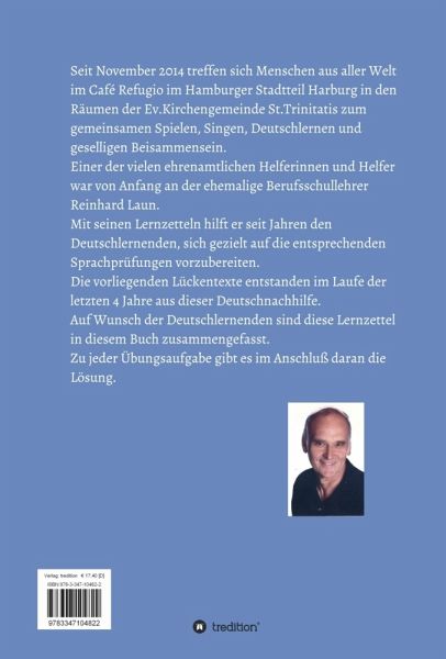 Dipl.Ing. Reinhard Laun hat eine über 30-jährige Erfahrung als Berufsschullehrer in Hamburg. Er besitzt das zweite Staatsexamen für das Höhere Lehramt an Berufsschulen für die beiden Fächer Elektrotechnik und Physik. In seiner Freizeit hilft er seit Jahren Hamburger Flüchtlingen im Café Refugio in HH-Harburg. Seine beliebten Lernzettel, die er für die Flüchtlinge verfasst hat, sind auf Wunsch vieler Deutschlerner in diesem Buch zusammengefasst. Dieses Buch ist für alle Migranten gedacht, die sich in Deutschland gründlich auf die Sprachtests vorbereiten wollen.