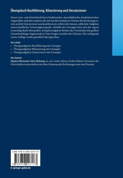 Dieses Lern- und Arbeitsbuch bietet Studierenden, Auszubildenden, Kaufmännischen Angestellten und allen anderen, die sich mit den komplexen Themen des Rechnungswesens und der Umsatzsteuer auseinandersetzen wollen oder müssen, zahlreiche Aufgaben unterschiedlicher Schwierigkeitsgrade. Mithilfe der Lösungen lässt sich der eigene Lernerfolg direkt überprüfen. Komplettaufgaben fördern das Verständnis für größere Zusammenhänge. Ergänzende Ja-Nein-Fragen vertiefen das Gelernte. Die vorliegende zweite Auflage wurde gründlich durchgesehen.