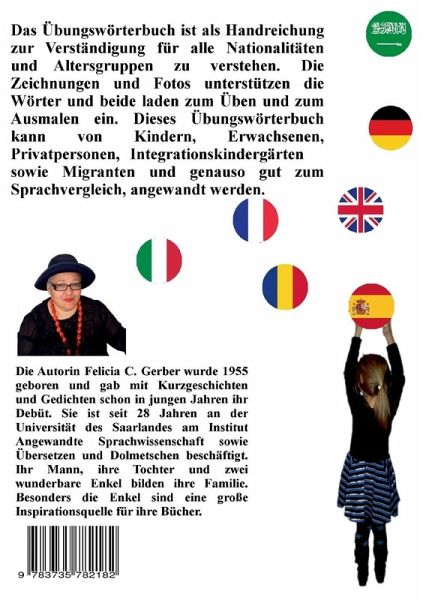 Das Übungswörterbuch ist als Handreichung zur Verständigung für alle Nationalitäten und Altersgruppen zu verstehen. Die Zeichnungen und Fotos unterstützen die Wörter und beide laden zum Üben und zum Ausmalen ein. Dieses Übungswörterbuch kann von Kindern, Erwachsenen, Privatpersonen, Integrationskindergärten sowie Migranten und genauso gut zum Sprachvergleich, angewandt werden.
