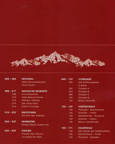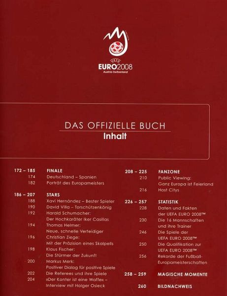 Das mit über 500 aktuellen Farbfotos reich illustrierte Rückschaubuch berichtet fachkundig von allen 31 Partien, den Stars und Trainern sowie vom Geschehen am Rande des Spielfeldes. Mit einer sechsseitigen Reportage steht das Endspiel besonders im Fokus. Und auch die Fans kommen zu Wort. Die besten Beiträge wurden prämiert und finden sich mit Namensnennung im Offiziellen Buch zum Turnier.