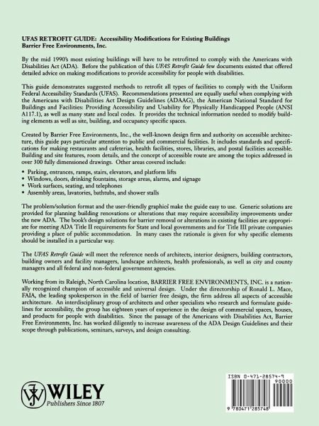 Detailed modification information for all parts of the structure and site While new construction has been built with accessibility as a leading priority for the past several decades, older buildings may have to undergo retrofitting to become compliant with modern regulations. UFAS Retrofit Guide: Accessibility Modifications for Existing Buildings provides comprehensive guidance toward retrofitting older structures to align with the Uniform Federal Accessibility Standards as well as ADA and ANSI guidelines. Presented in a problem-solution format, this guide provides technical information for modifications of parking, entrances, workspaces, assembly areas, bathrooms, and more.