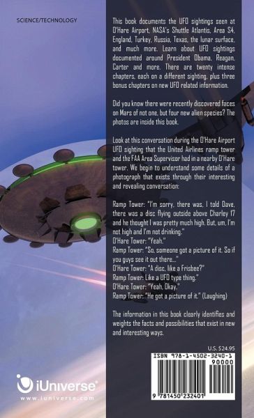 This book documents the UFO sightings seen at O'Hare Airport, NASA's Shuttle Atlantis, Area S4, England, Turkey, Russia, Texas, the lunar surface, and much more. Learn about UFO sightings documented around President Obama, Reagan, Carter and more. There are twenty intense chapters, each on a different sighting, plus three bonus chapters on new UFO related information. Did you know there were recently discovered faces on Mars of not one, but four new alien species? The photos are inside this book. Look at this conversation during the O'Hare Airport UFO sighting that the United Airlines ramp tower and the FAA Area Supervisor had in a nearby O'Hare tower. We begin to understand some details of a photograph that exists through their interesting and revealing conversation: Ramp Tower: "I'm sorry, there was, I told Dave, there was a disc flying outside above Charley 17 and he thought I was pretty much high. But, um, I'm not high and I'm not drinking." O'Hare Tower: "Yeah." Ramp Tower: "So, someone got a picture of it. So if you guys see it out there..." O'Hare Tower: "A disc, like a Frisbee?" Ramp Tower: Like a UFO type thing." O'Hare Tower: "Yeah, Okay." Ramp Tower: "He got a picture of it." (Laughing) The information in this book clearly identifies and weights the facts and possibilities that exist in new and interesting ways.