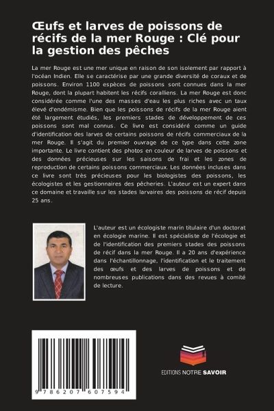 La mer Rouge est une mer unique en raison de son isolement par rapport à l'océan Indien. Elle se caractérise par une grande diversité de coraux et de poissons. Environ 1100 espèces de poissons sont connues dans la mer Rouge, dont la plupart habitent les récifs coralliens. La mer Rouge est donc considérée comme l'une des masses d'eau les plus riches avec un taux élevé d'endémisme. Bien que les poissons de récifs de la mer Rouge aient été largement étudiés, les premiers stades de développement de ces poissons sont mal connus. Ce livre est considéré comme un guide d'identification des larves de certains poissons de récifs commerciaux de la mer Rouge. Il s'agit du premier ouvrage de ce type dans cette zone importante. Le livre contient des photos en couleur de larves de poissons et des données précieuses sur les saisons de frai et les zones de reproduction de certains poissons commerciaux. Les données incluses dans ce livre sont très précieuses pour les biologistes des poissons, les écologistes et les gestionnaires des pêcheries. L'auteur est un expert dans ce domaine et travaille sur les stades larvaires des poissons de récif depuis 25 ans.
