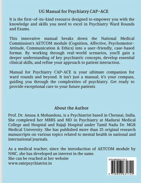 It is the first-of-its-kind resource designed to empower you with the knowledge and skills you need to excel in Psychiatry Ward Rounds and Exams. This innovative manual breaks down the National Medical Commission's AETCOM module (Cognition, Affective, Psychomotor- Attitude, Communication & Ethics) into a user-friendly, case-based format. By working through real-world scenarios, you'll gain a deeper understanding of key psychiatric concepts, develop essential clinical skills, and refine your approach to patient interaction. Manual for Psychiatry CAP-ACE is your ultimate companion for ward rounds and beyond. It isn't just a manual; it's your compass, guiding you through the complexities of psychiatry. Get ready to provide exceptional care to your future patients