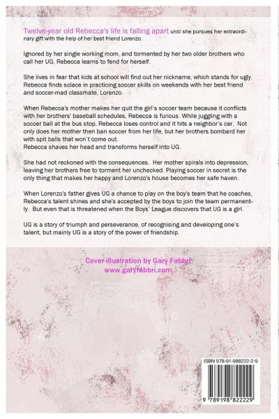 UG - Twelve-year old Rebecca's life is falling apart until she pursues her extraordinary gift with the help of her best friend Lorenzo. Rebecca has a dismal life. Ignored by her single working mom, and tormented by her two older brothers who call her UG, Rebecca learns to fend for herself. She lives in fear that kids at school will find out her nickname, which stands for ugly. Rebecca finds solace in practicing soccer skills on weekends with her best friend and soccer-mad classmate, Lorenzo. When Rebecca's mother makes her quit the girl's soccer team because it conflicts with her brothers' baseball schedules, Rebecca is furious. While juggling with a soccer ball at the bus stop, Rebecca loses control and it hits a neighbor's car. Not only does her mother then ban soccer from her life but her brothers bombard her with spit balls that won't come out. Rebecca shaves her head and transforms herself into UG. She had not reckoned with the consequences. Her mother spirals into depression, leaving her brothers free to torment her unchecked. Playing soccer in secret is the only thing that makes her happy and Lorenzo's house becomes her safe haven, thanks to the intervention of Social Services. When Lorenzo's father gives UG a chance to play on the boy's team that he coaches, Rebecca's talent shines and she's accepted by the boys to join the team permanently. But even that is threatened when the Boys' League discovers that UG is a girl. UG is a story of triumph and perseverance, of recognising and developing one's talent, but mainly UG is a story of the power of friendship.