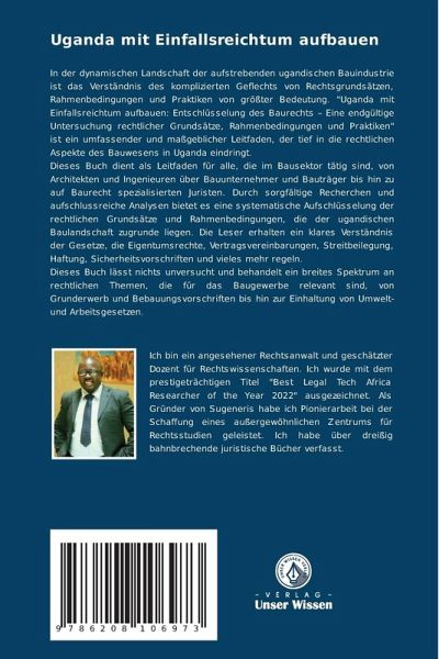 In der dynamischen Landschaft der aufstrebenden ugandischen Bauindustrie ist das Verständnis des komplizierten Geflechts von Rechtsgrundsätzen, Rahmenbedingungen und Praktiken von größter Bedeutung. "Uganda mit Einfallsreichtum aufbauen: Entschlüsselung des Baurechts - Eine endgültige Untersuchung rechtlicher Grundsätze, Rahmenbedingungen und Praktiken" ist ein umfassender und maßgeblicher Leitfaden, der tief in die rechtlichen Aspekte des Bauwesens in Uganda eindringt.Dieses Buch dient als Leitfaden für alle, die im Bausektor tätig sind, von Architekten und Ingenieuren über Bauunternehmer und Bauträger bis hin zu auf Baurecht spezialisierten Juristen. Durch sorgfältige Recherchen und aufschlussreiche Analysen bietet es eine systematische Aufschlüsselung der rechtlichen Grundsätze und Rahmenbedingungen, die der ugandischen Baulandschaft zugrunde liegen. Die Leser erhalten ein klares Verständnis der Gesetze, die Eigentumsrechte, Vertragsvereinbarungen, Streitbeilegung, Haftung, Sicherheitsvorschriften und vieles mehr regeln. Dieses Buch lässt nichts unversucht und behandelt ein breites Spektrum an rechtlichen Themen, die für das Baugewerbe relevant sind, von Grunderwerb und Bebauungsvorschriften bis hin zur Einhaltung von Umwelt- und Arbeitsgesetzen.