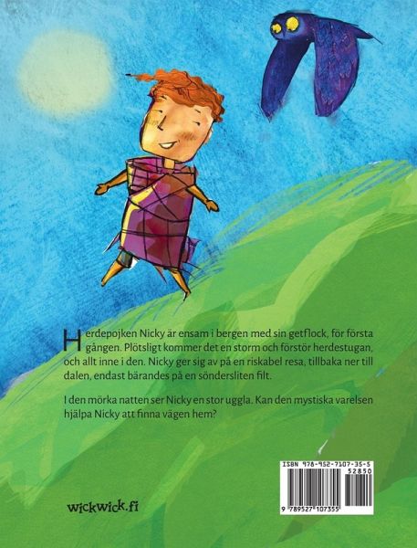 For the first time, the shepherd boy, Nicky, is alone in the mountains with his herd of goats. All of a sudden, a storm strikes and destroys the shepherd’s cottage and everything in it. Nicky embarks on a perilous journey back to his home valley, carrying nothing but a torn blanket. In the darkness of night, Nicky spots a big owl. Can the mysterious creature help Nicky find his way home? --- Herdepojken Nicky är ensam i bergen med sin getflock, för första gången. Plötsligt kommer det en storm och förstör herdestugan, och allt inne i den. Nicky ger sig av på en riskabel resa, tillbaka ner till dalen, endast bärandes på en söndersliten filt. I den mörka natten ser Nicky en stor uggla. Kan den mystiska varelsen hjälpa Nicky att finna vägen hem?