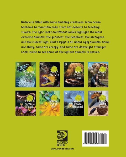 From ocean bottoms to mountain tops, from hot deserts to freezing tundra, the Ugh! Yuck! and Whoa! books highlight the most extreme animals: the grossest, the deadliest, the strangest, and the ugliest! This book is all about ugly animals. Some are slimy, some are creepy, and some are downright strange!