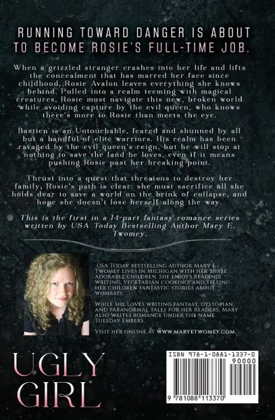 Running toward danger is about to become Rosie's full-time job. When a grizzled stranger crashes into her life and lifts the concealment that has marred her face since childhood, Rosie Avalon leaves everything she knows behind. Pulled into a realm teeming with magical creatures, Rosie must navigate this new, broken world while avoiding capture by the evil queen, who knows there's more to Rosie than meets the eye. Bastien is an Untouchable, feared and shunned by all but a handful of elite warriors. His realm has been ravaged by the evil queen's reign, but he will stop at nothing to save the land he loves, even if it means pushing Rosie past her breaking point. Thrust into a quest that threatens to destroy her family, Rosie's path is clear: she must sacrifice all she holds dear to save a world on the brink of collapse, and hope she doesn't lose herself along the way. This is the first in a 14-part fantasy romance series written by USA Today Bestselling Author Mary E. Twomey.