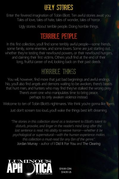 UGLY STORIES Enter the fevered imagination of Tobin Elliott. Ten awful stories await you. Tales of love, tales of hate, tales of wonder, tales of horror. Ugly stories. About terrible people. Doing horrible things. TERRIBLE PEOPLE In this first collection, you'll find some terribly awful people-some friends, some family, some enemies, and some lovers. Some are just starting out, whether they're testing their newfound powers, or their newfound hungers, and claiming their first victims. Others you'll find at the end of their long, fruitful career of evil, looking back on their past deeds. HORRIBLE THINGS You will, however, find more that just bad beginnings and awful endings. No, you'll find angels and demons, waiting to be awoken, there's beasts that hunt men, and hunters who may find they've stalked the wrong prey. There's even one who manipulates time to bring peace, perhaps to only awaken violence instead. Welcome to ten of Tobin Elliott's nightmares. We think you're gonna like them. Just don't scream too loud...you'll wake the things best left dreaming.