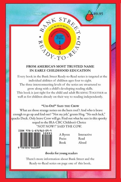What are those strange noises on the barn roof? And who is brave enough to go up and find out? "Not my job," grunts Hog. "No such luck," quacks Duck. Only brave Crow will go. Find out what he sees in this spooky sequel to the IRA-CBC Children's Choice "NOT NOW!" SAID THE COW. FROM AMERICA'S MOST TRUSTED NAME IN EARLY CHILDHOOD EDUCATION More than seventy years of educational research and innovative teaching have given the Bank Street College of Education the reputation as America's most trusted name in early childhood education. Because no two children are exactly alike in their development, we have designed the Bank Street Ready-to-Read series in three levels to accommodate the individual stages of reading readiness of children ages four through eight. • Level 1: GETTING READY TO READ- (PRE-K to GRADE 1) Books are perfect for reading aloud with children who are getting ready to read or are just beginning to read words or phrases. • Level 2: READING TOGETHER-(GRADES 1 to 3) Books are written especiallly for children who are on their way to reading independently but who may need help. • Level 3: I CAN READ IT MYSELF-(GRADES 2 to 3) Books are designed for children able to read on their own. They also can be enjoyed as read-alouds.