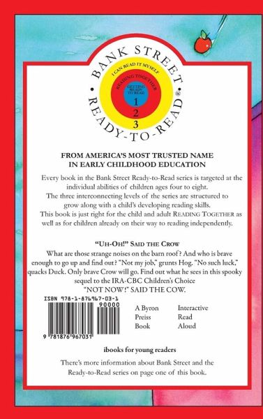 What are those strange noises on the barn roof? And who is brave enough to go up and find out? "Not my job," grunts Hog. "No such luck," quacks Duck. Only brave Crow will go. Find out what he sees in this spooky sequel to the IRA-CBC Children's Choice "NOT NOW!" SAID THE COW. ¿FROM AMERICA'S MOST TRUSTED NAME IN EARLY CHILDHOOD EDUCATION More than seventy years of educational research and innovative teaching have given the Bank Street College of Education the reputation as America's most trusted name in early childhood education. Because no two children are exactly alike in their development, we have designed the Bank Street Ready-to-Read series in three levels to accommodate the individual stages of reading readiness of children ages four through eight. • Level 1: GETTING READY TO READ- (PRE-K to GRADE 1) Books are perfect for reading aloud with children who are getting ready to read or are just beginning to read words or phrases. • Level 2: READING TOGETHER-(GRADES 1 to 3) Books are written especiallly for children who are on their way to reading independently but who may need help. • Level 3: I CAN READ IT MYSELF-(GRADES 2 to 3) Books are designed for children able to read on their own. They also can be enjoyed as read-alouds.
