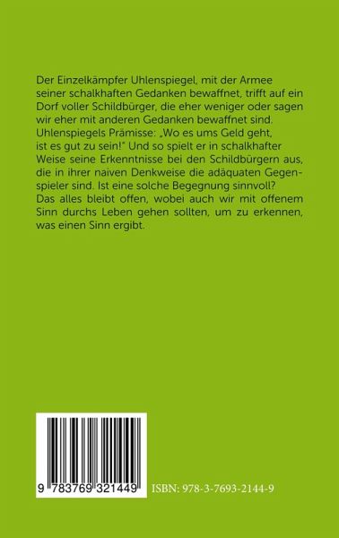 Der Einzelkämpfer Uhlenspiegel, mit der Armee seiner schalkhaften Gedanken bewaffnet, trifft auf ein Dorf voller Schildbürger, die eher weniger oder sagen wir eher mit anderen Gedanken bewaffnet sind. Uhlenspiegels Prämisse: Wo es ums Geld geht, ist es gut zu sein! Und so spielt er in schalkhafter Weise seine Erkenntnisse bei den Schildbürgern aus, die in ihrer naiven Denkweise die adäquaten Gegenspieler sind. Ist eine solche Begegnung sinnvoll? Amüsant und kurzweilig auf alle Fälle!