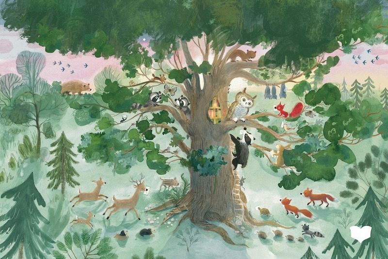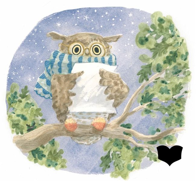 Tatjana Mai-Wyss entführt zur Geschichte von Christelle Saquet mit stimmungsvollen Bildern in den nächtlichen Wald zur Baumbibliothek von Uhu Uhuwe und seinen Freunden.