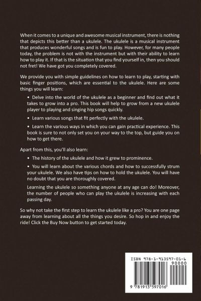 The ukulele is a musical instrument that produces wonderful songs and is fun to play. We provide you with simple guidelines on how to learn to play, starting with basic finger positions, which are essential to the ukulele. Here are some things you will learn: Delve into the world of the ukulele as a beginner and find out what it takes to grow into a pro. This book will help to grow from a new ukulele player to playing and singing hip songs quickly. Learn various songs that fit perfectly with the ukulele. Learn the various ways in which you can gain practical experience. This book is sure to not only set you on your way to the top, but guide you on how to get there. Apart from this, you’ll also learn: You will learn about the various chords and how to successfully strum your ukulele. We also have tips on how to hold the ukulele. You will have no doubt that you are thoroughly covered.